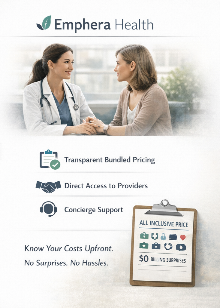 Traditional healthcare systems often require patients to navigate complicated insurance approvals, long wait times, and unclear pricing. Emphera Health removes these barriers by connecting patients directly with providers through pre-negotiated bundled pricing and concierge support.